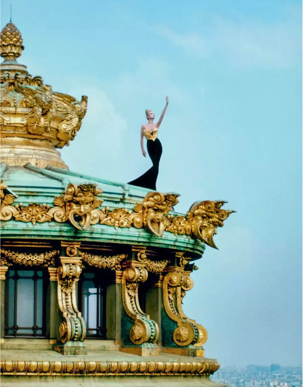 Museum Piece by Thierry Mugler 1986 "Benitier Plisse" Gold Lame and Black Velvet Gown. Photographer by Thierry Mugler at Le Opéra de Paris. Size 36
