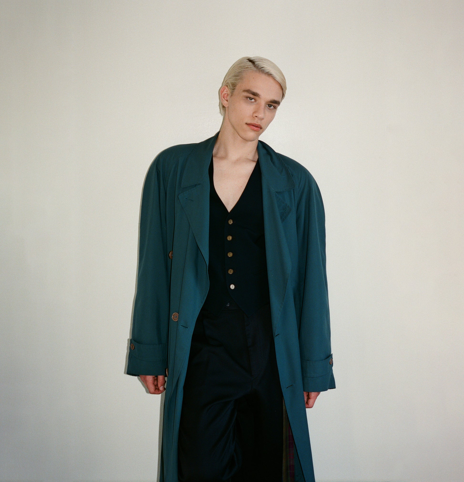 Mallard Color Wool trench Coat with Waist Belt and Tartan Plaid Lining.