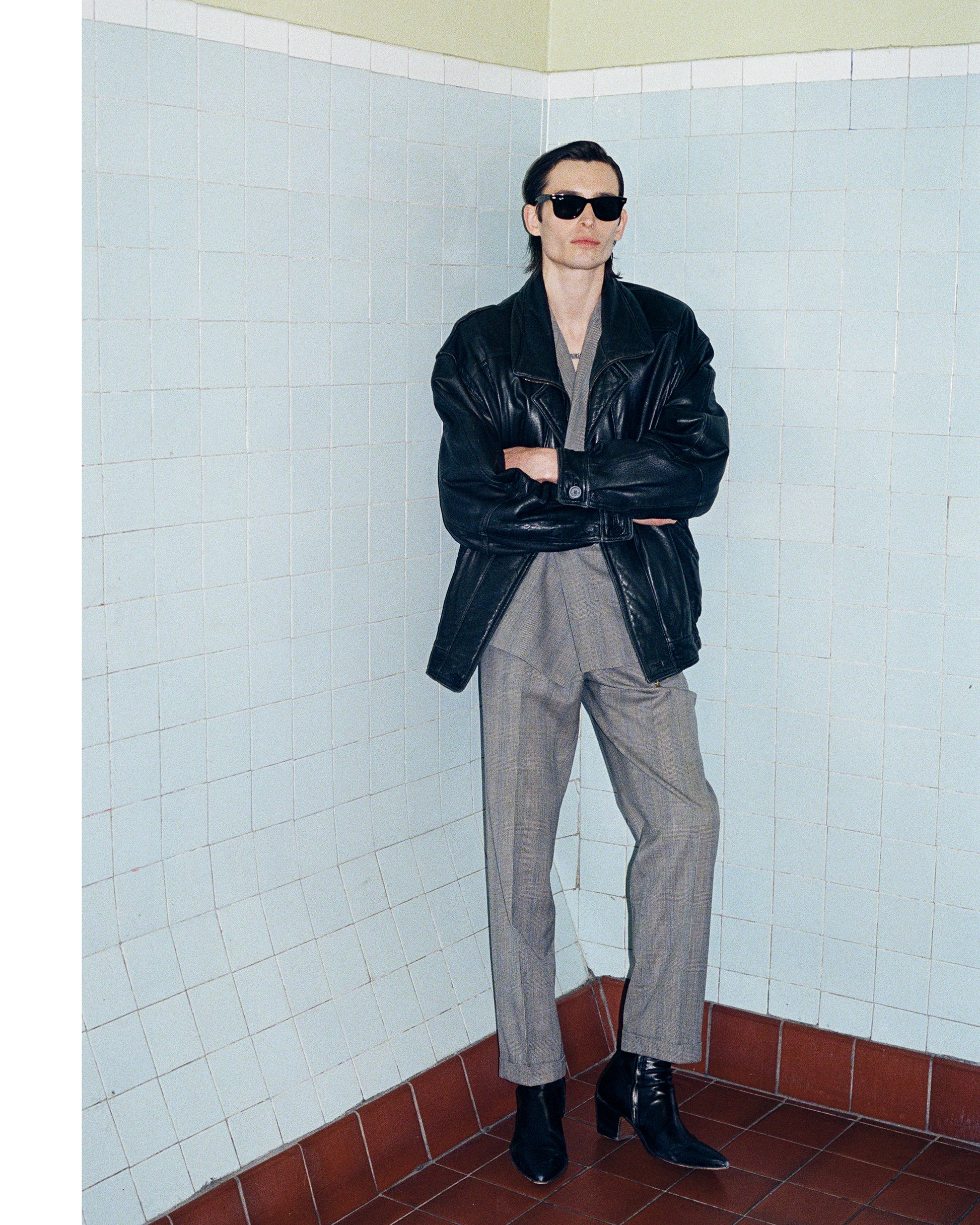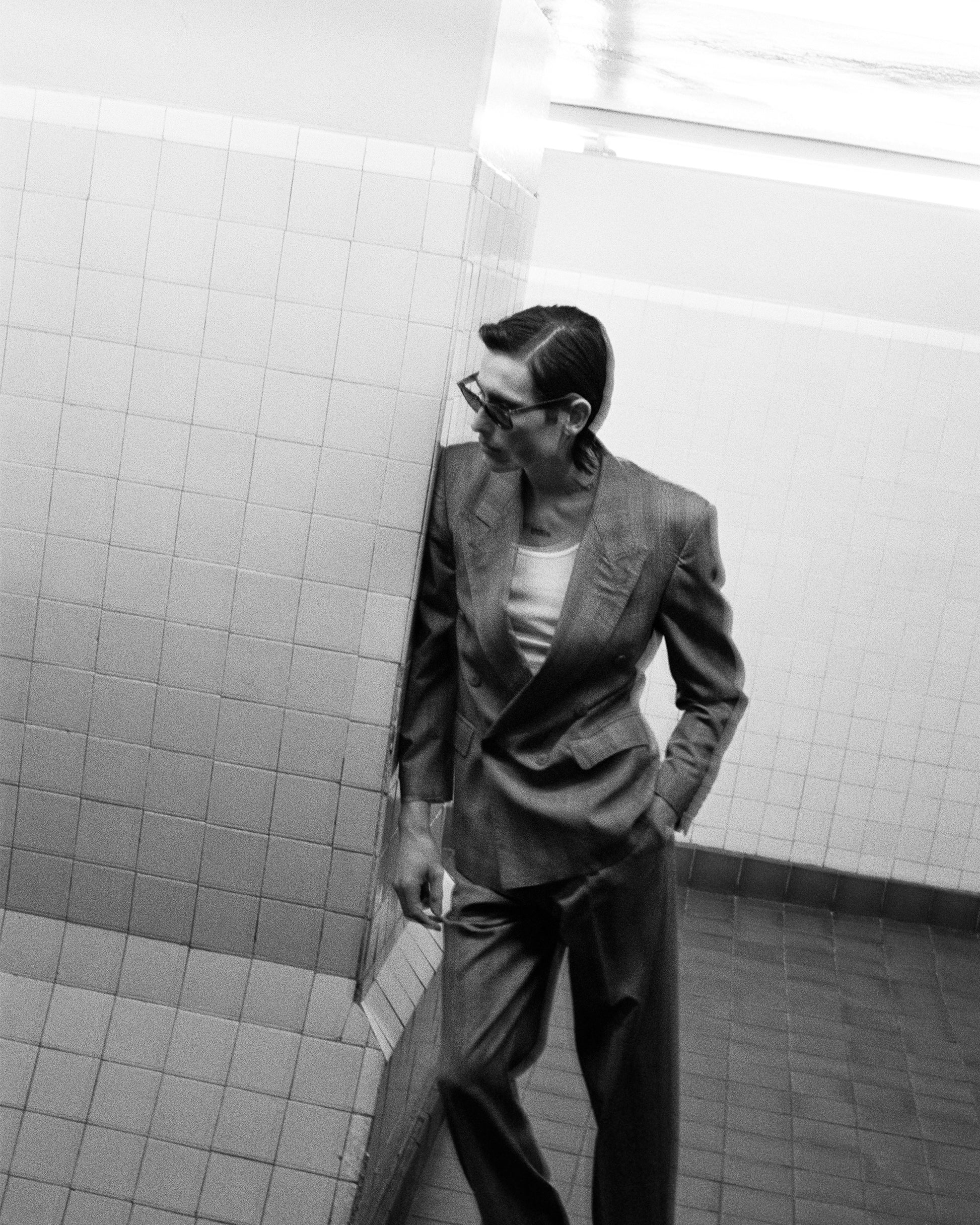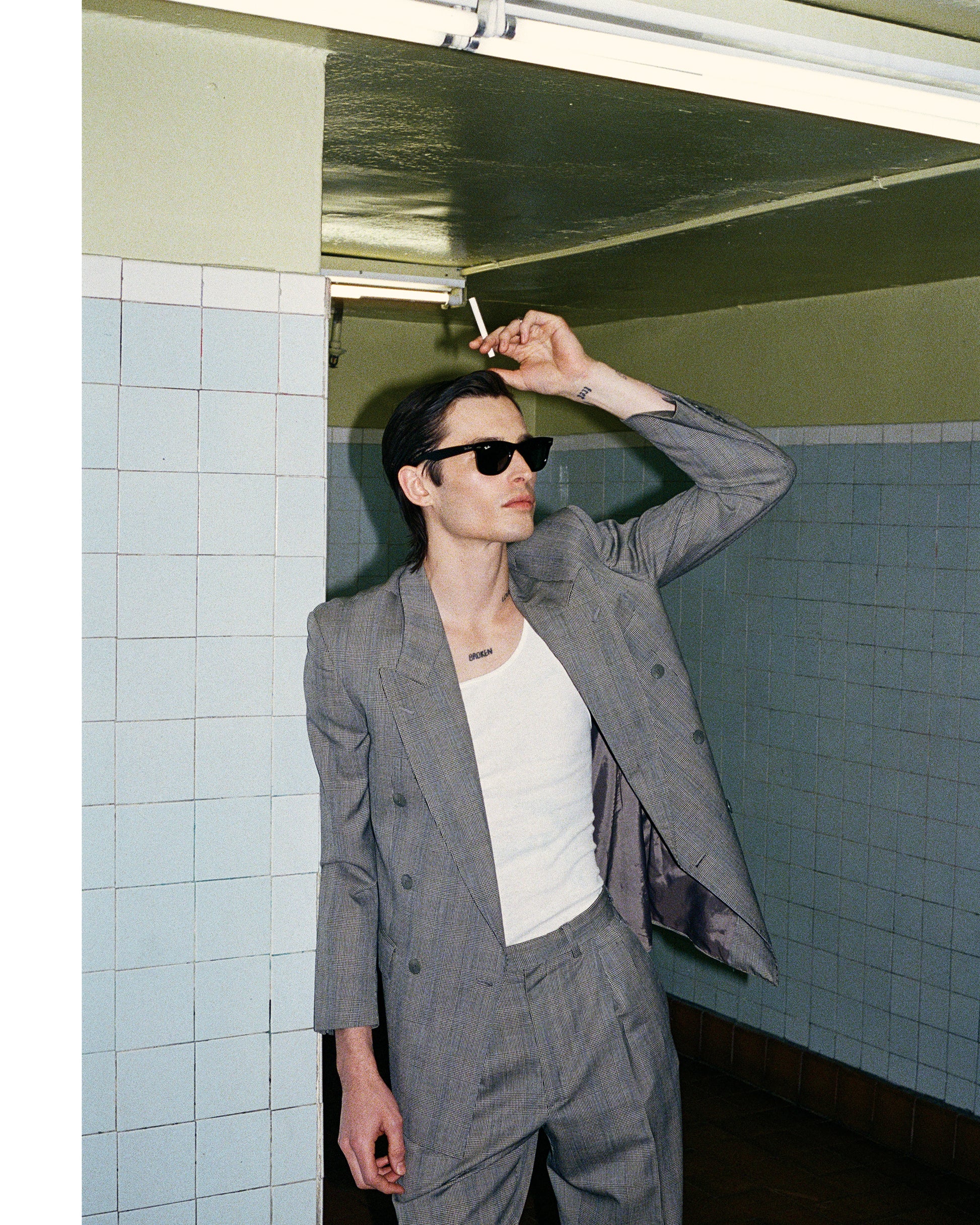Yves Saint Laurent 80's grey Prince of Wales two piece suit with double-breasted blazer and pleated, cuffed Trousers. Made In France Size 42